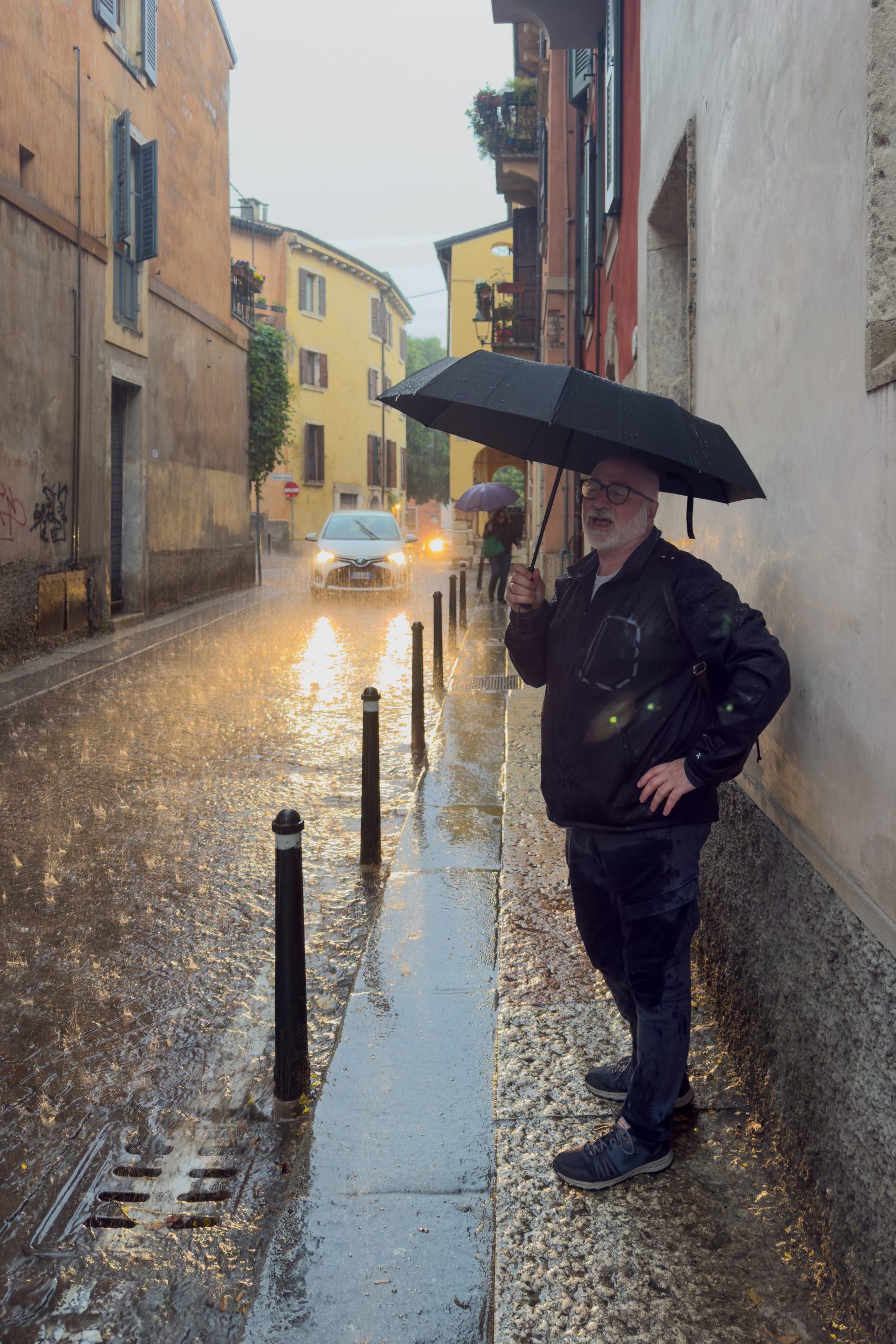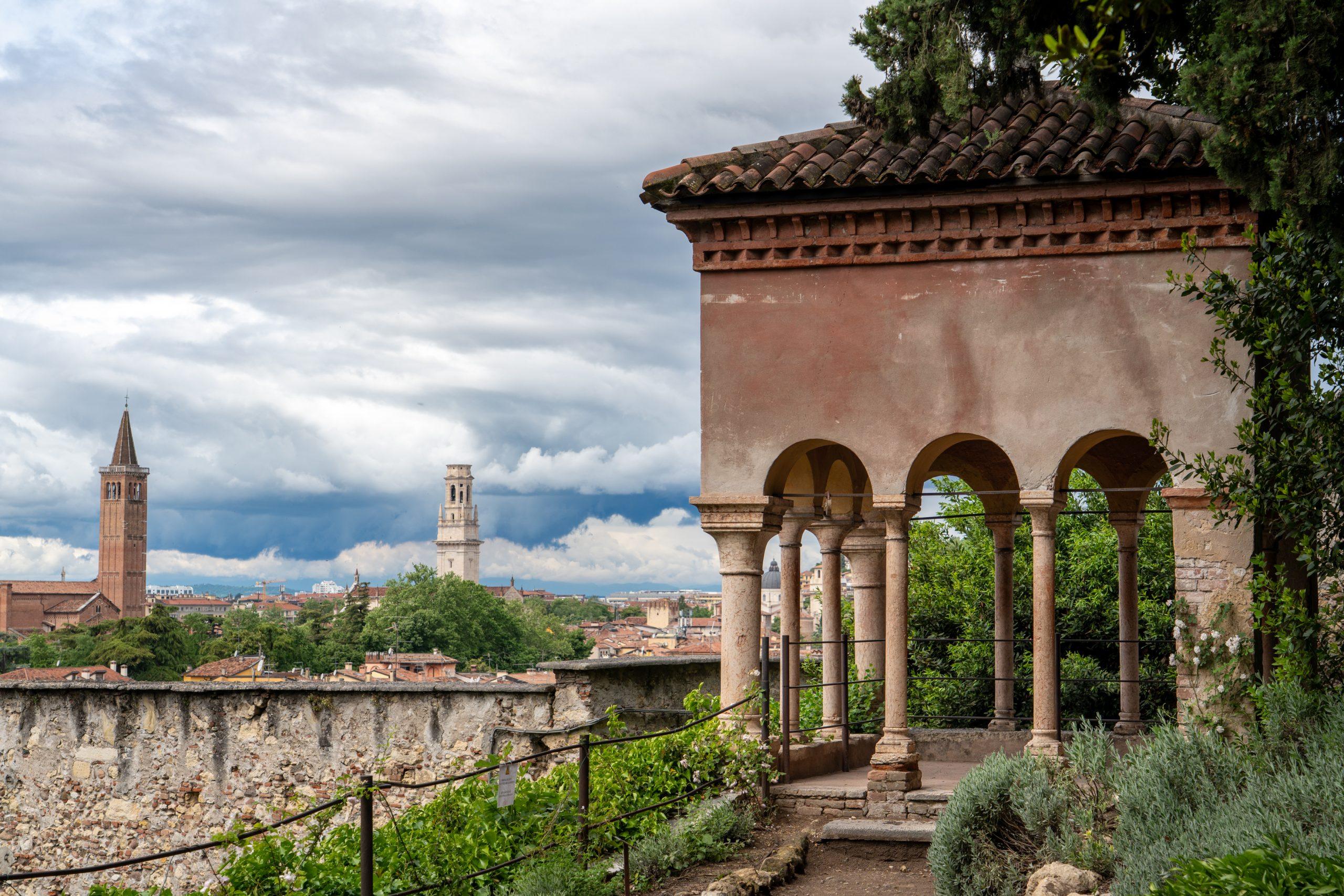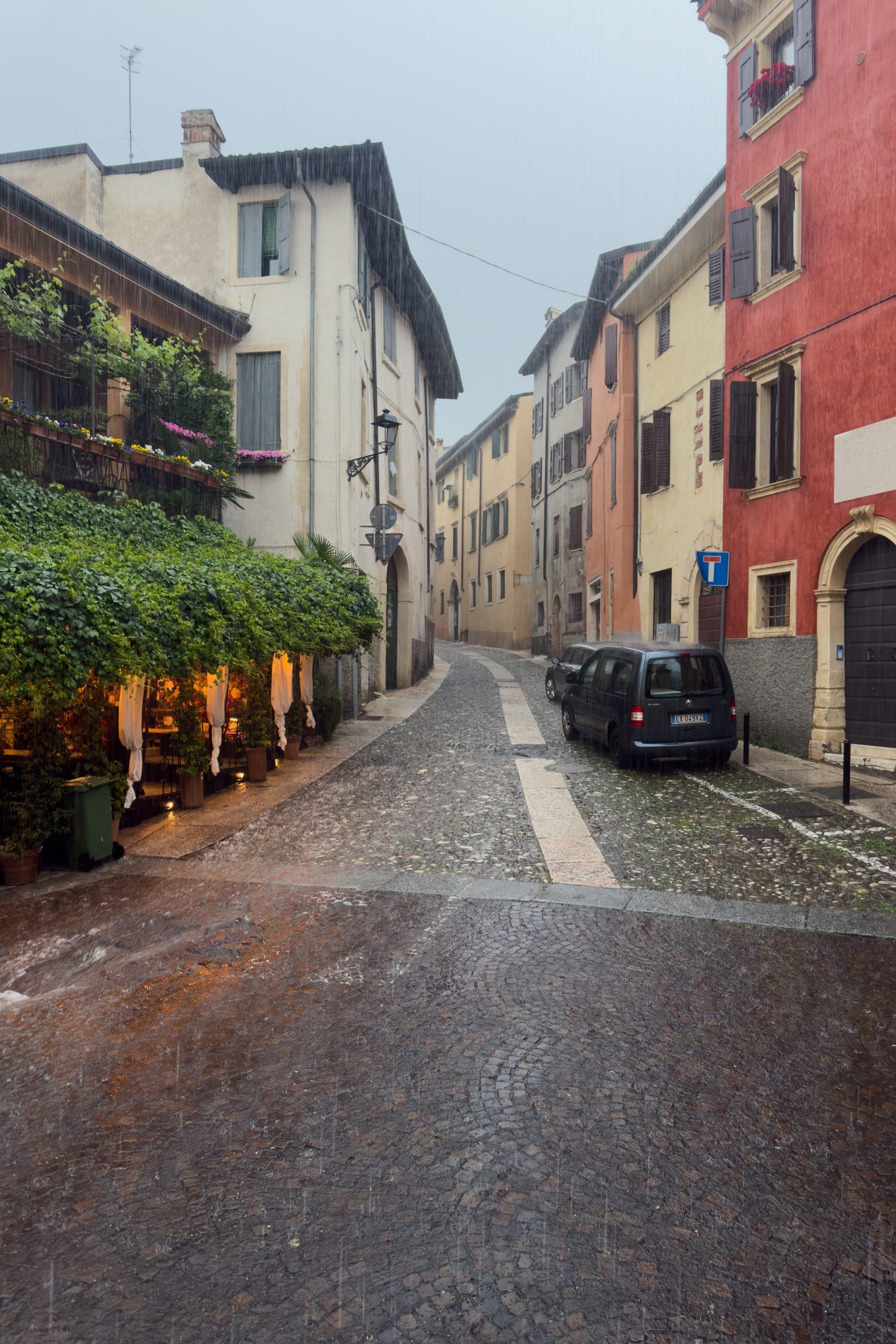 But from a distance clouds were quickly gathering above Verona and we could hear the thunder from a distance. Once we were down again it started raining so we looked for shelter under an arch. There were some extremely loud thunders trucks and a short shower before we continued our walk.