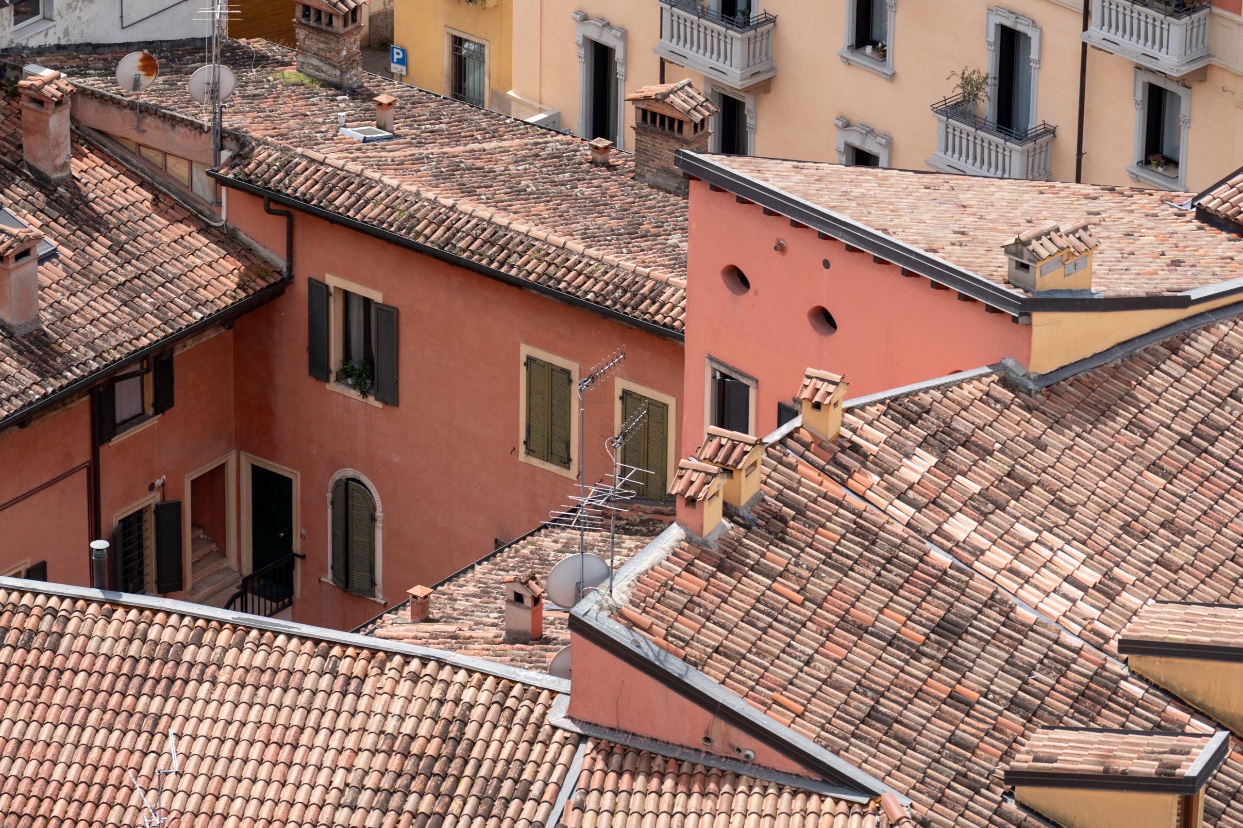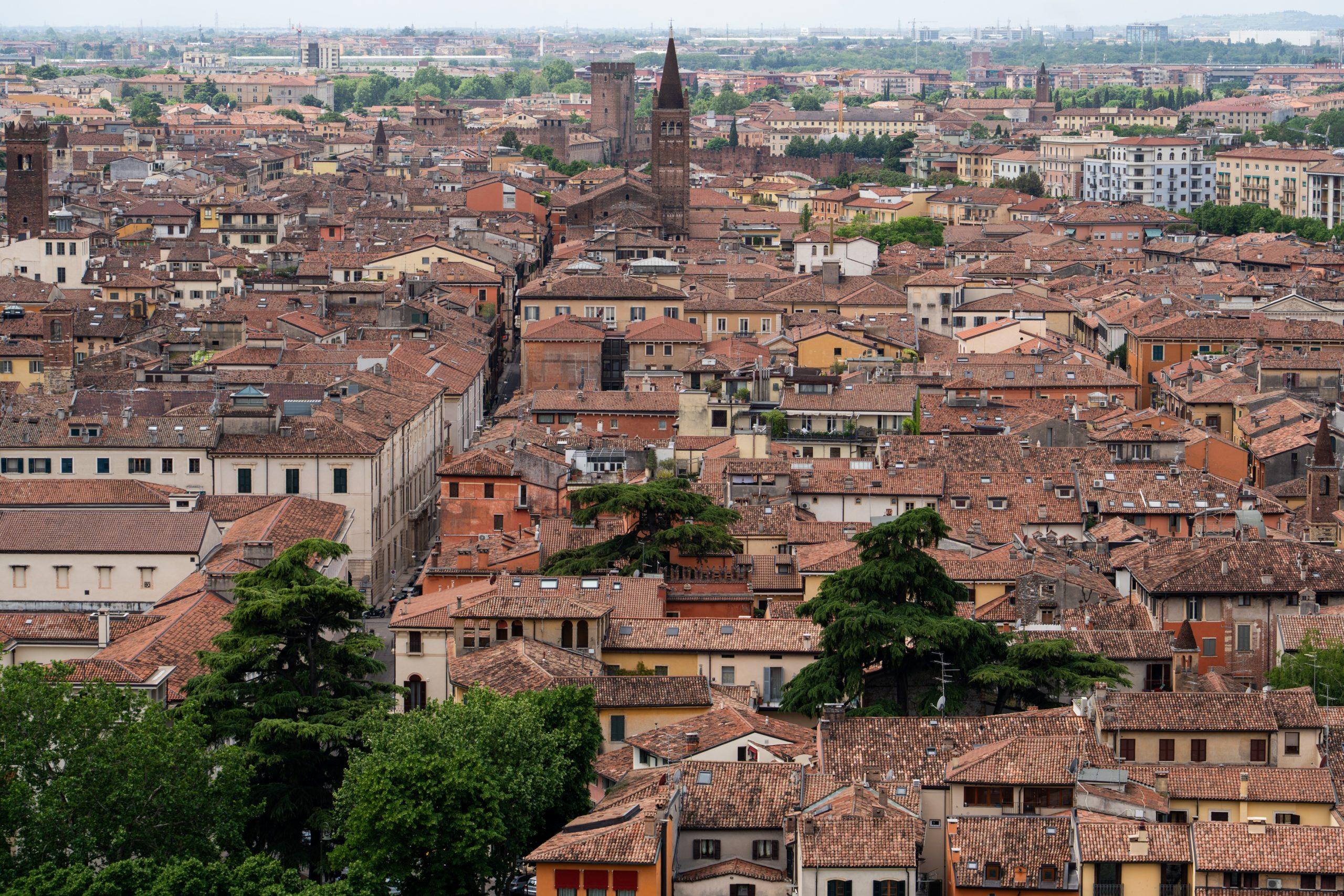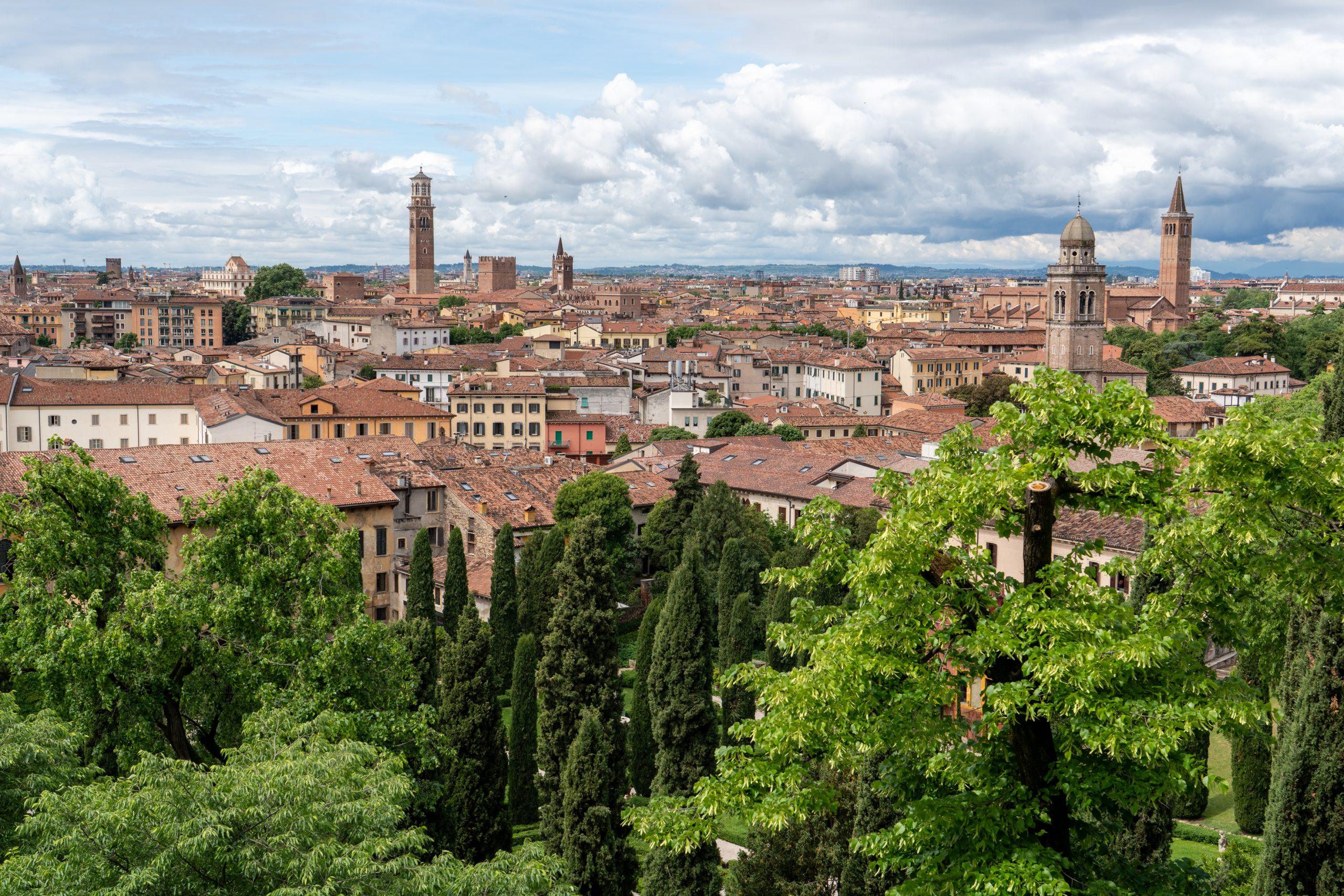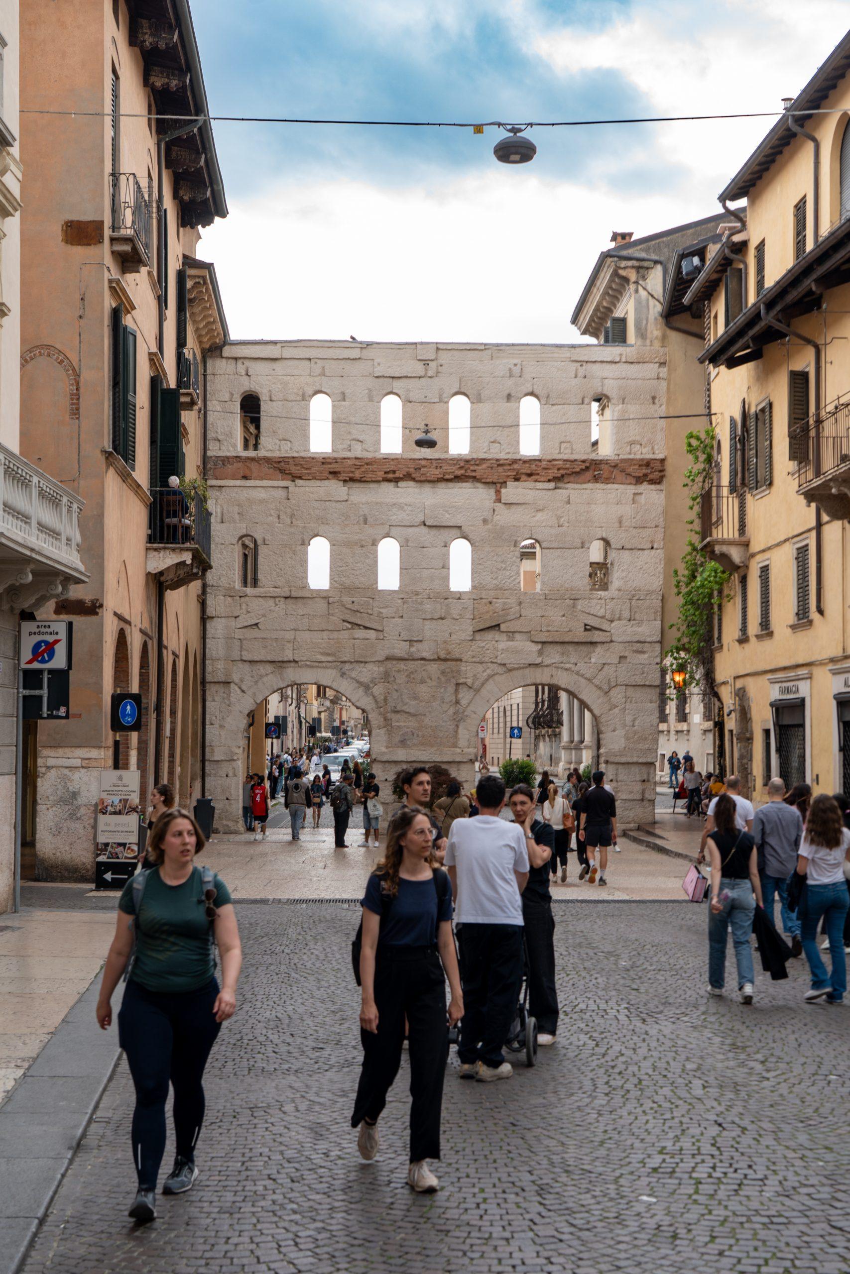 But from a distance clouds were quickly gathering above Verona and we could hear the thunder from a distance. Once we were down again it started raining so we looked for shelter under an arch. There were some extremely loud thunders trucks and a short shower before we continued our walk.
