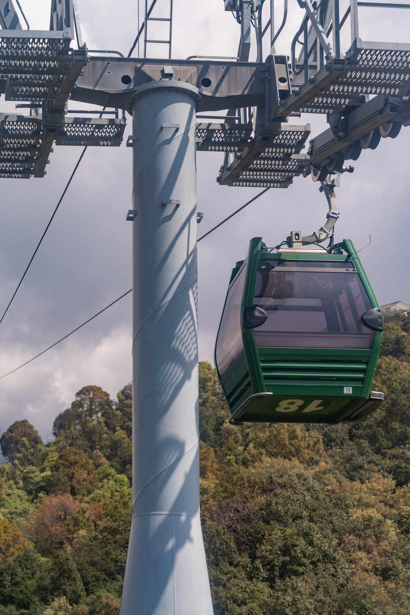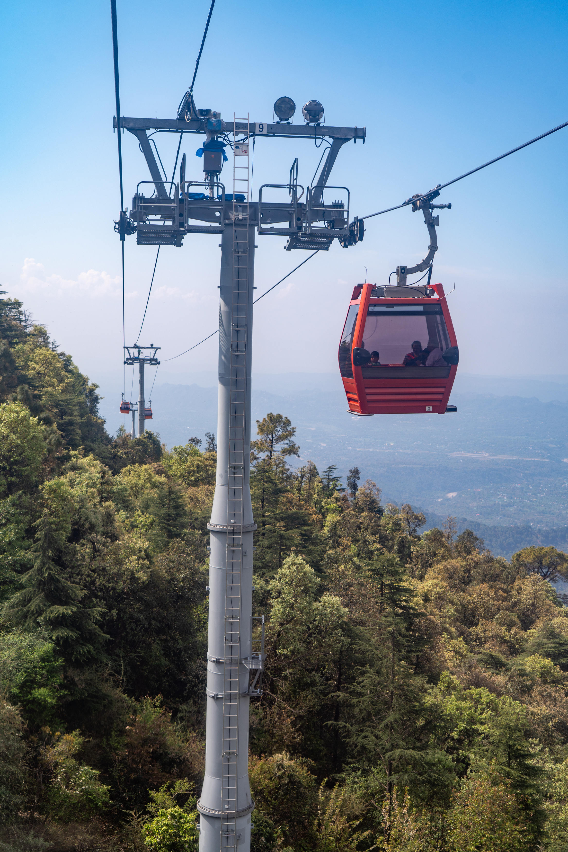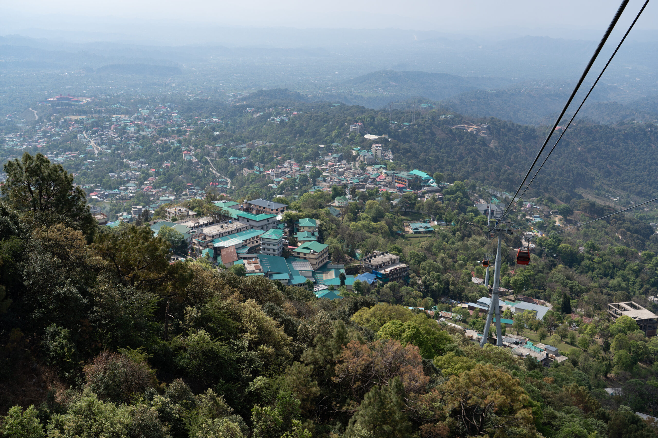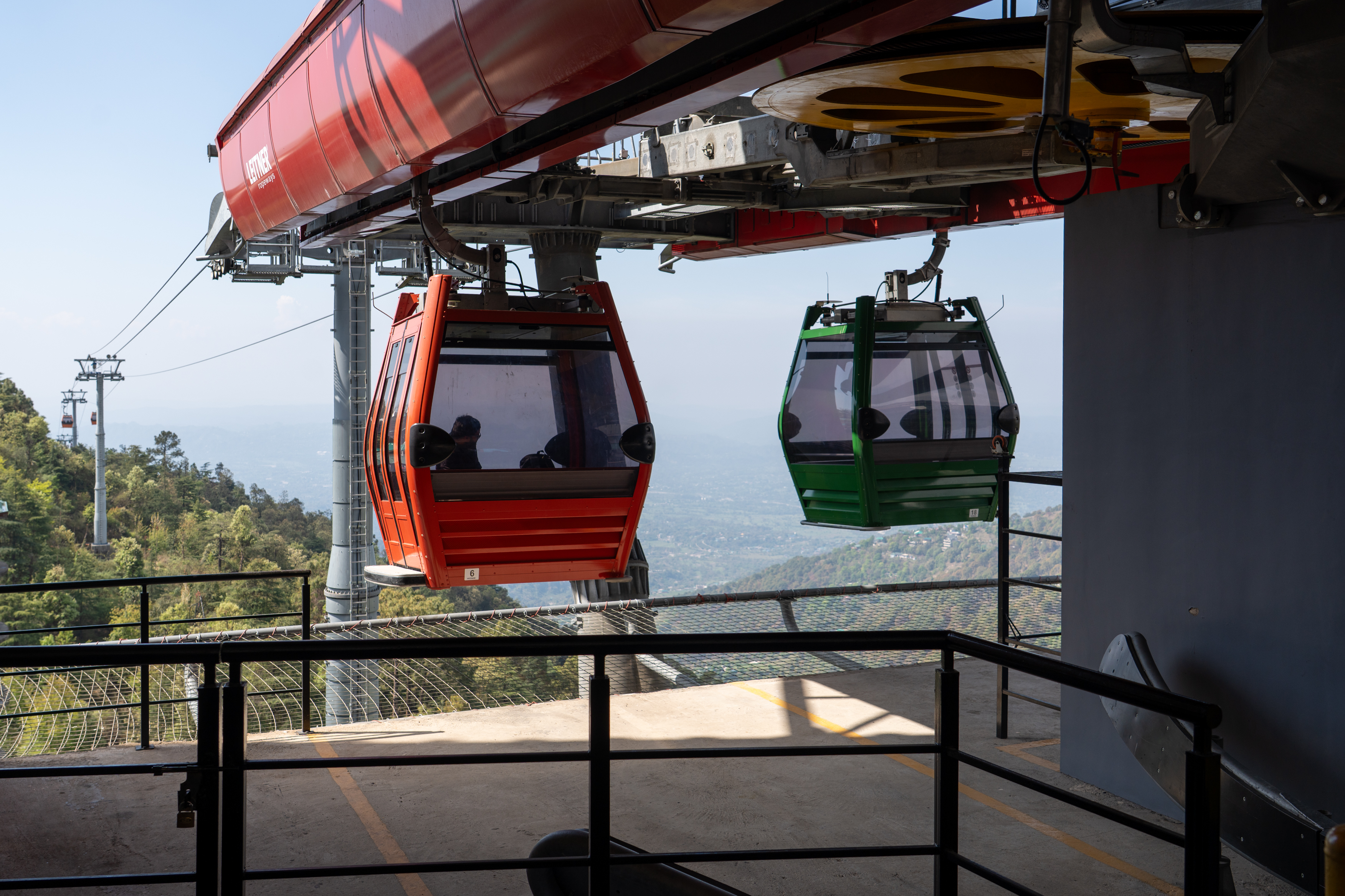 Around 11 O’clock the work was finished and the ropeway functional again. It connects the lower town to the popular hill destination of McLeod Ganj. Stretching about 1.8 km, the ropeway provides a quick 10-minute ride that replaces the longer, winding road journey. After I got my ticket, I boarded a gondola for the ride to Dharamsala and enjoyed stunning aerial views of the Dhauladhar mountains, forests, and Kangra Valley.