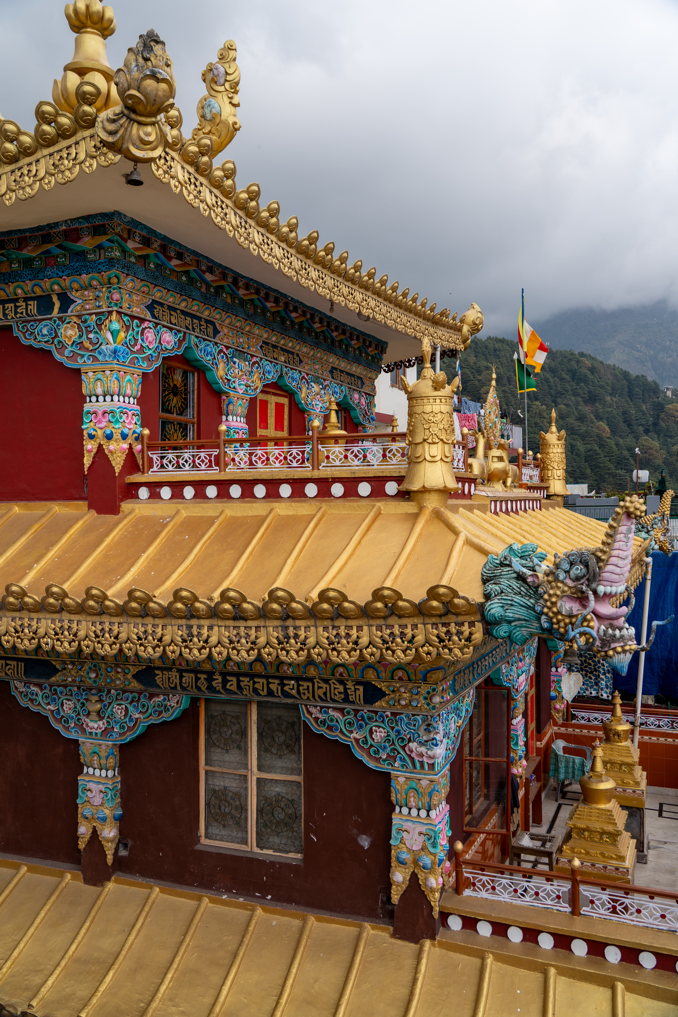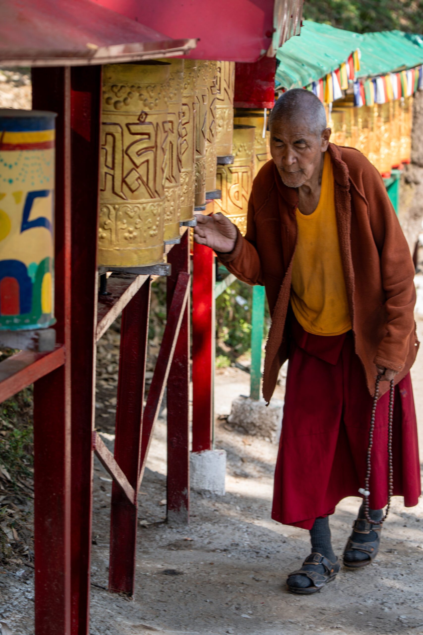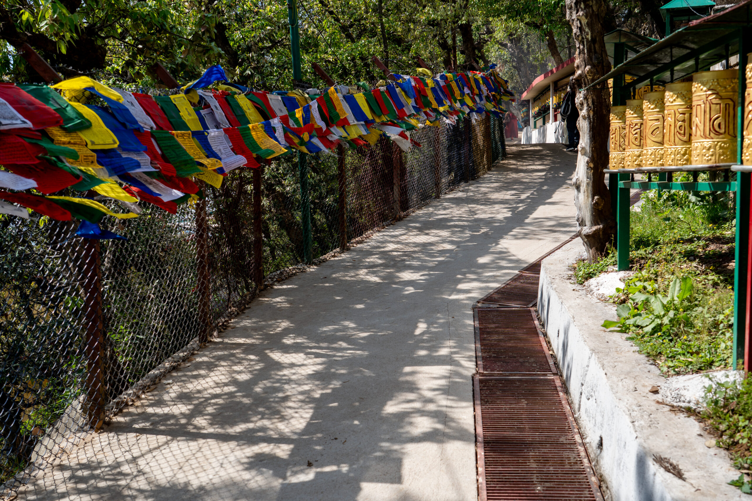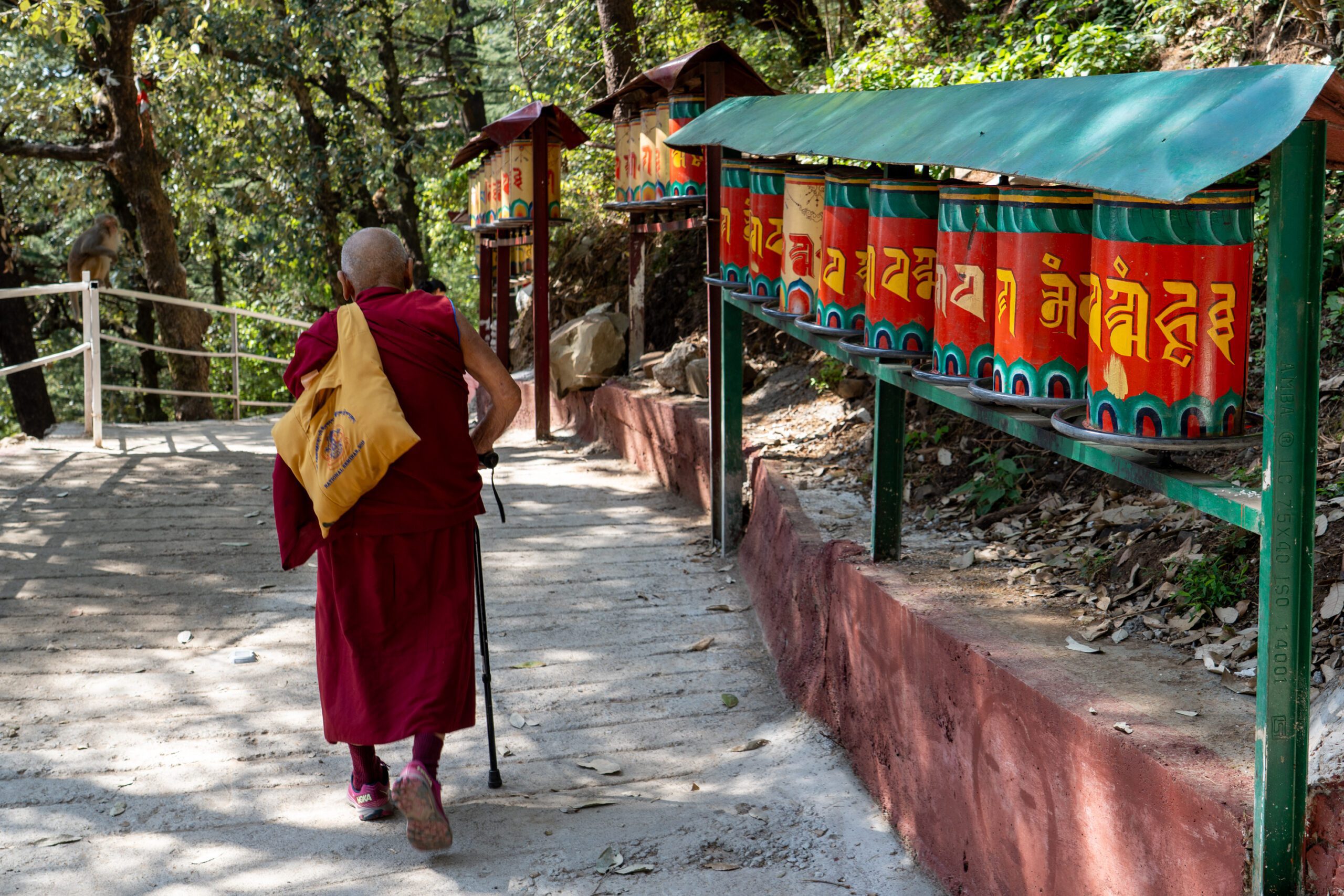 As it was still quiet, I decided to walk the Kora circuit around the temple, a peaceful walking path used for circumambulation, a sacred Buddhist practice. Lined with prayer wheels, fluttering flags, and small shrines, the trail winded through quiet forested areas and offered beautiful views of the mountains. According tradition I walked the circuit clockwise, spinned some wheels and chanted “Om Padme Hum”, which created a calm, almost meditative atmosphere that reflected Tibetan spiritual traditions.