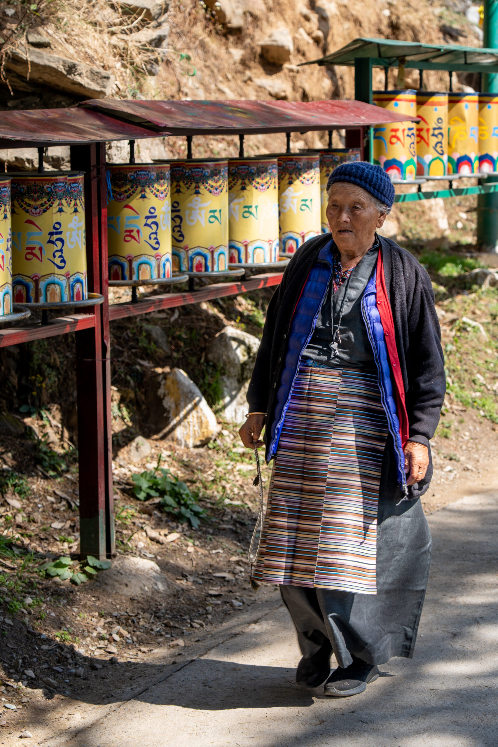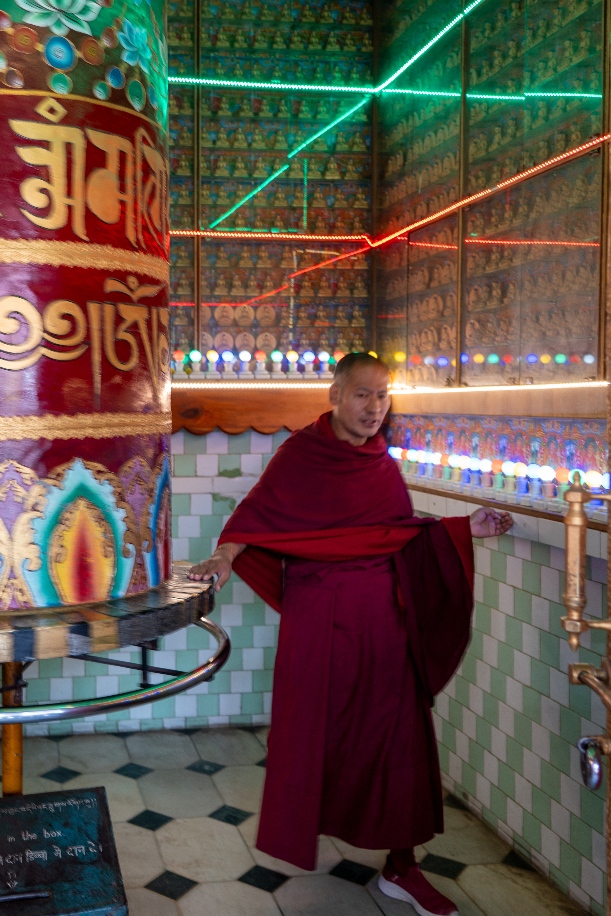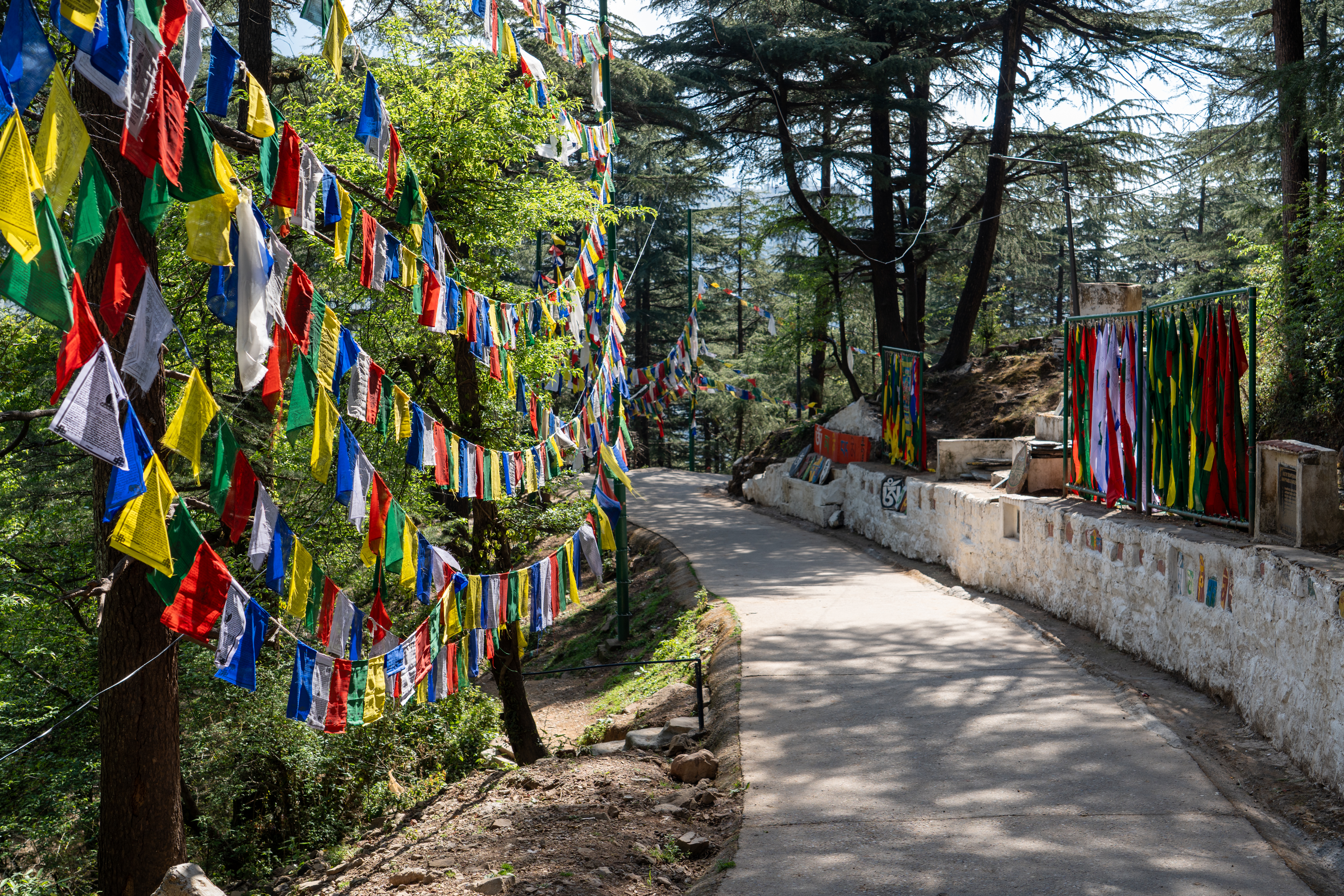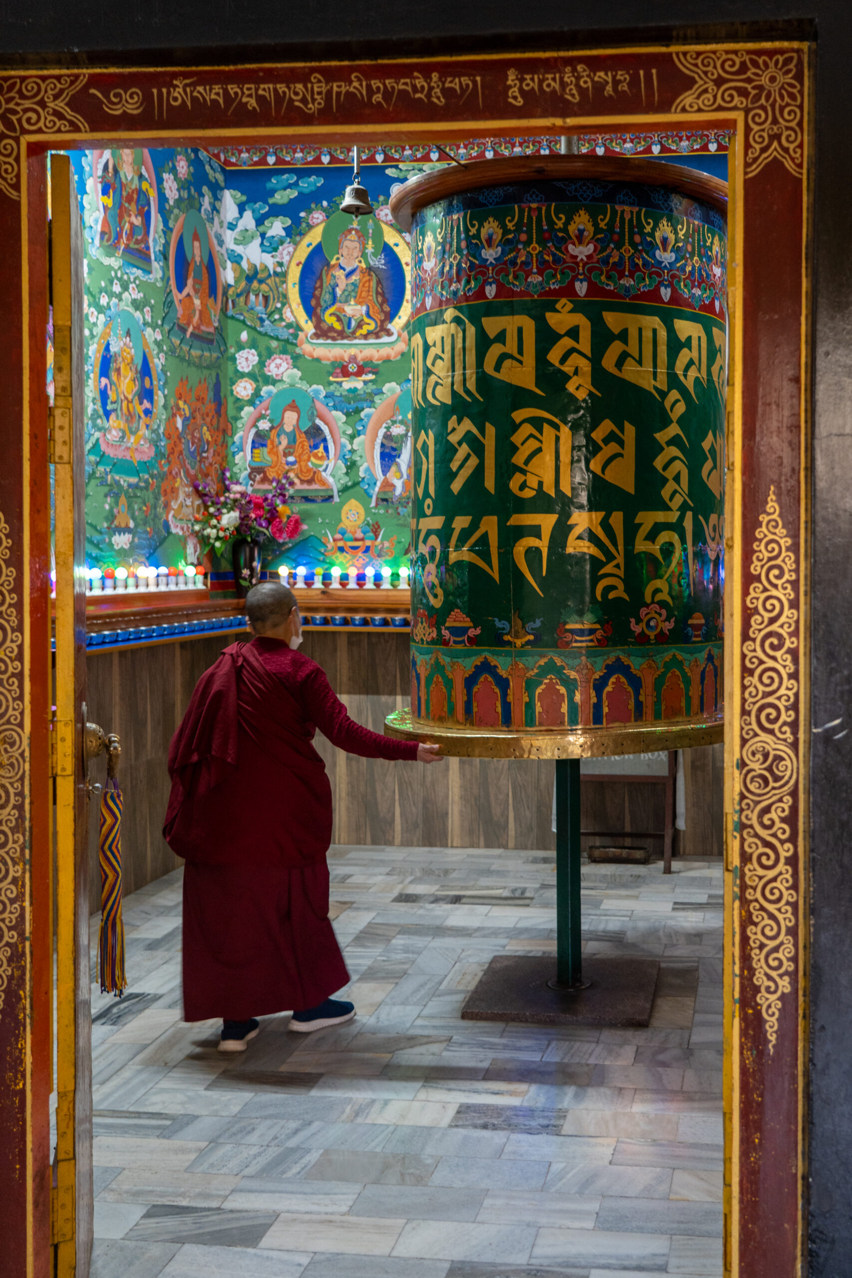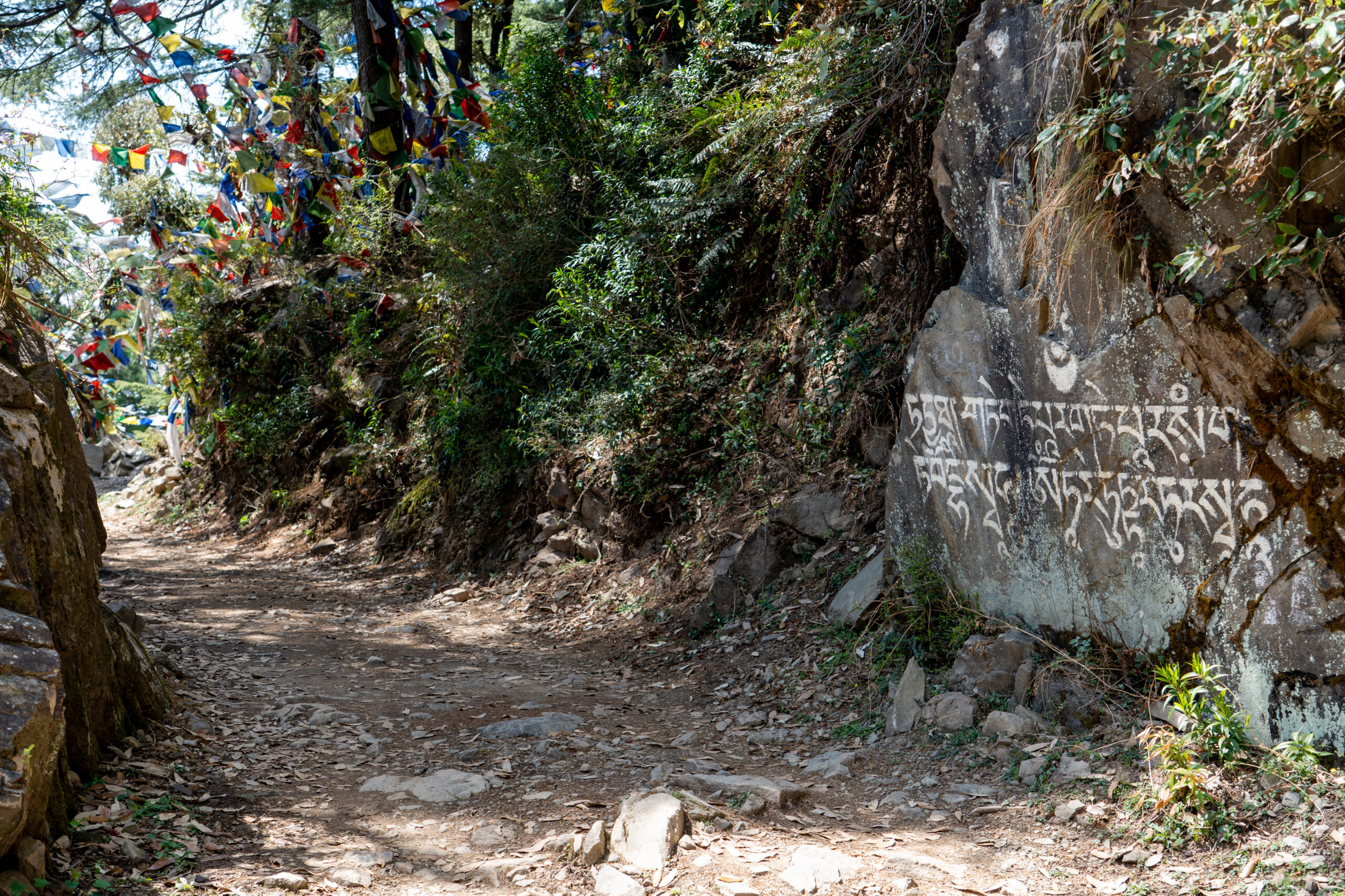 As it was still quiet, I decided to walk the Kora circuit around the temple, a peaceful walking path used for circumambulation, a sacred Buddhist practice. Lined with prayer wheels, fluttering flags, and small shrines, the trail winded through quiet forested areas and offered beautiful views of the mountains. According tradition I walked the circuit clockwise, spinned some wheels and chanted “Om Padme Hum”, which created a calm, almost meditative atmosphere that reflected Tibetan spiritual traditions.