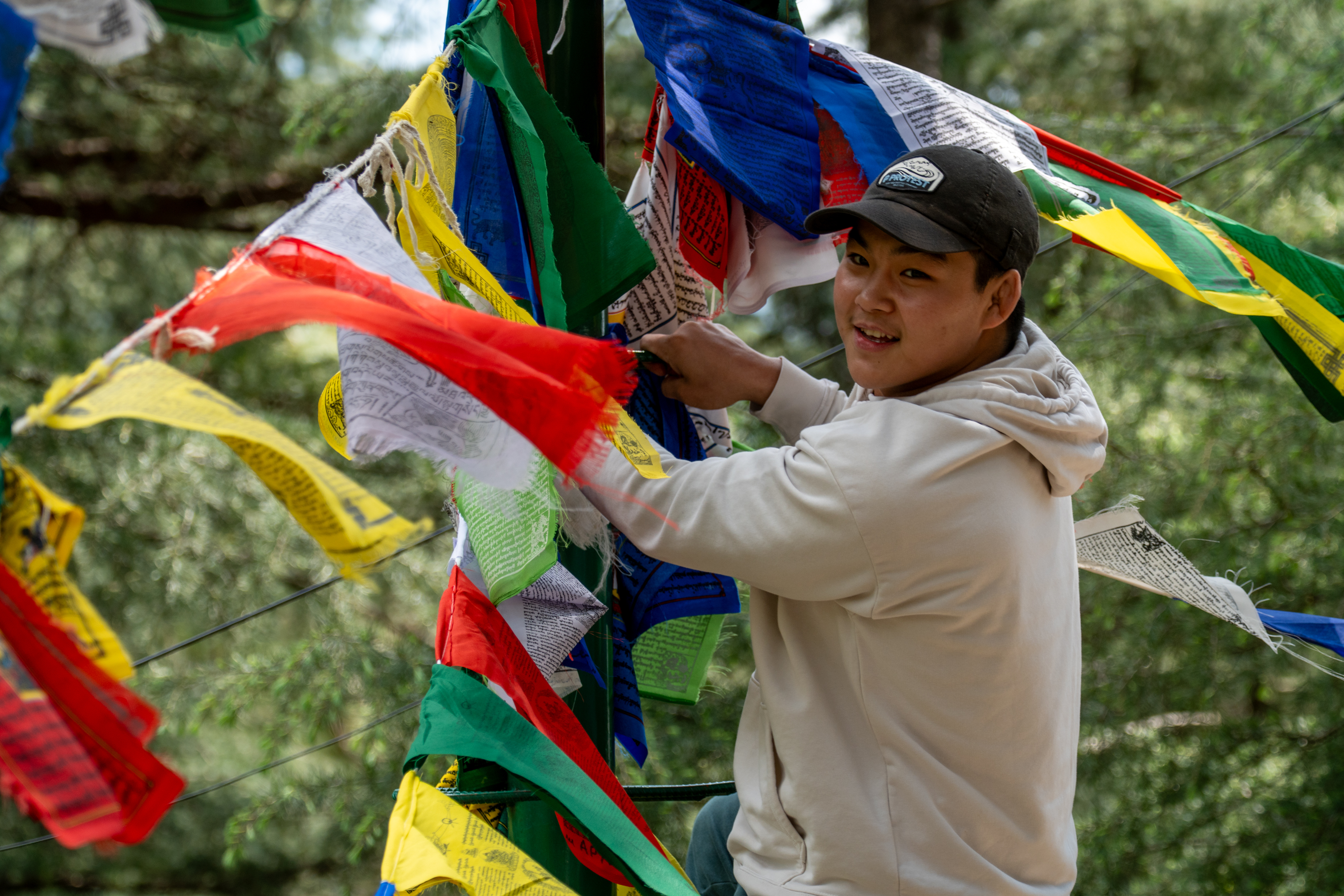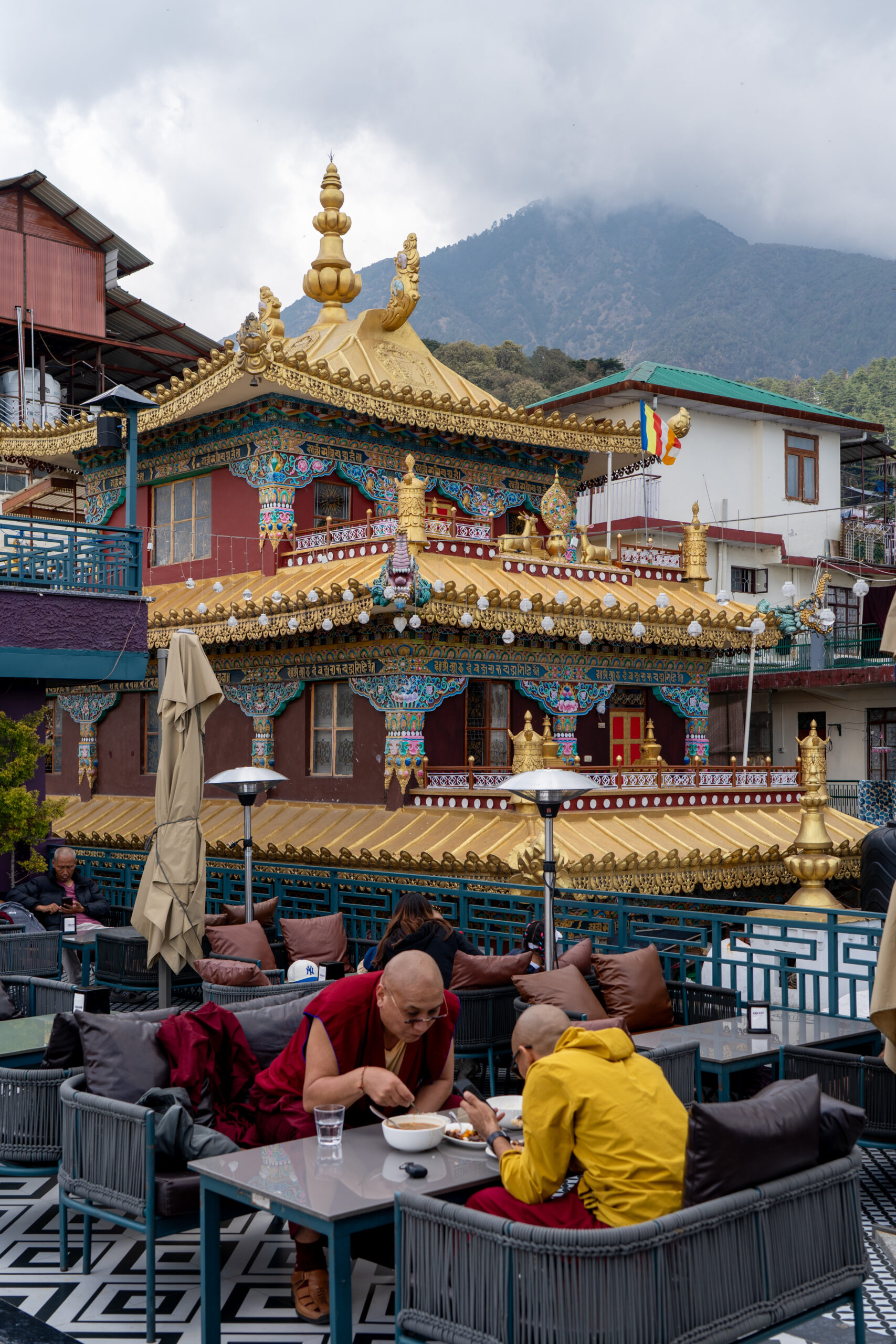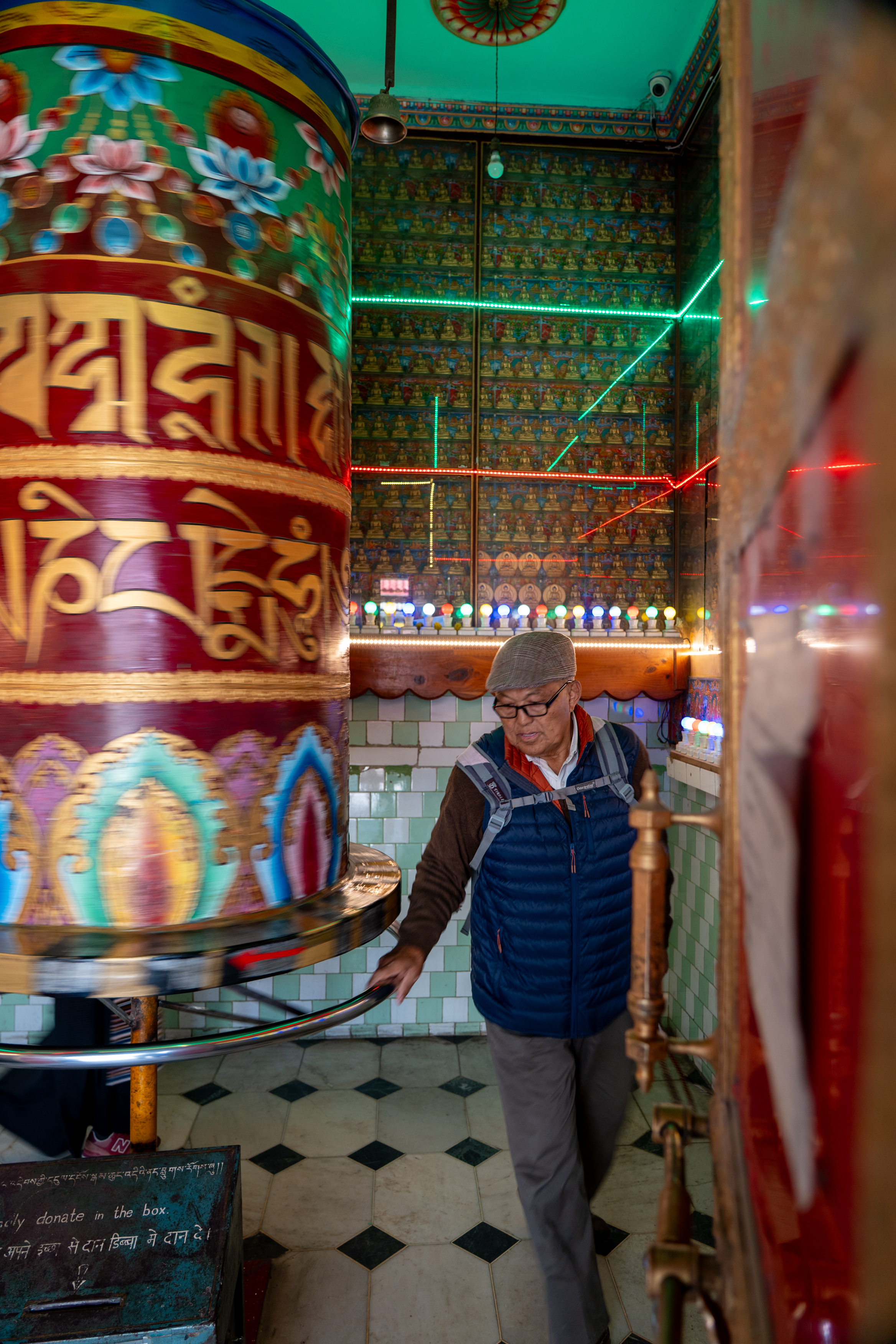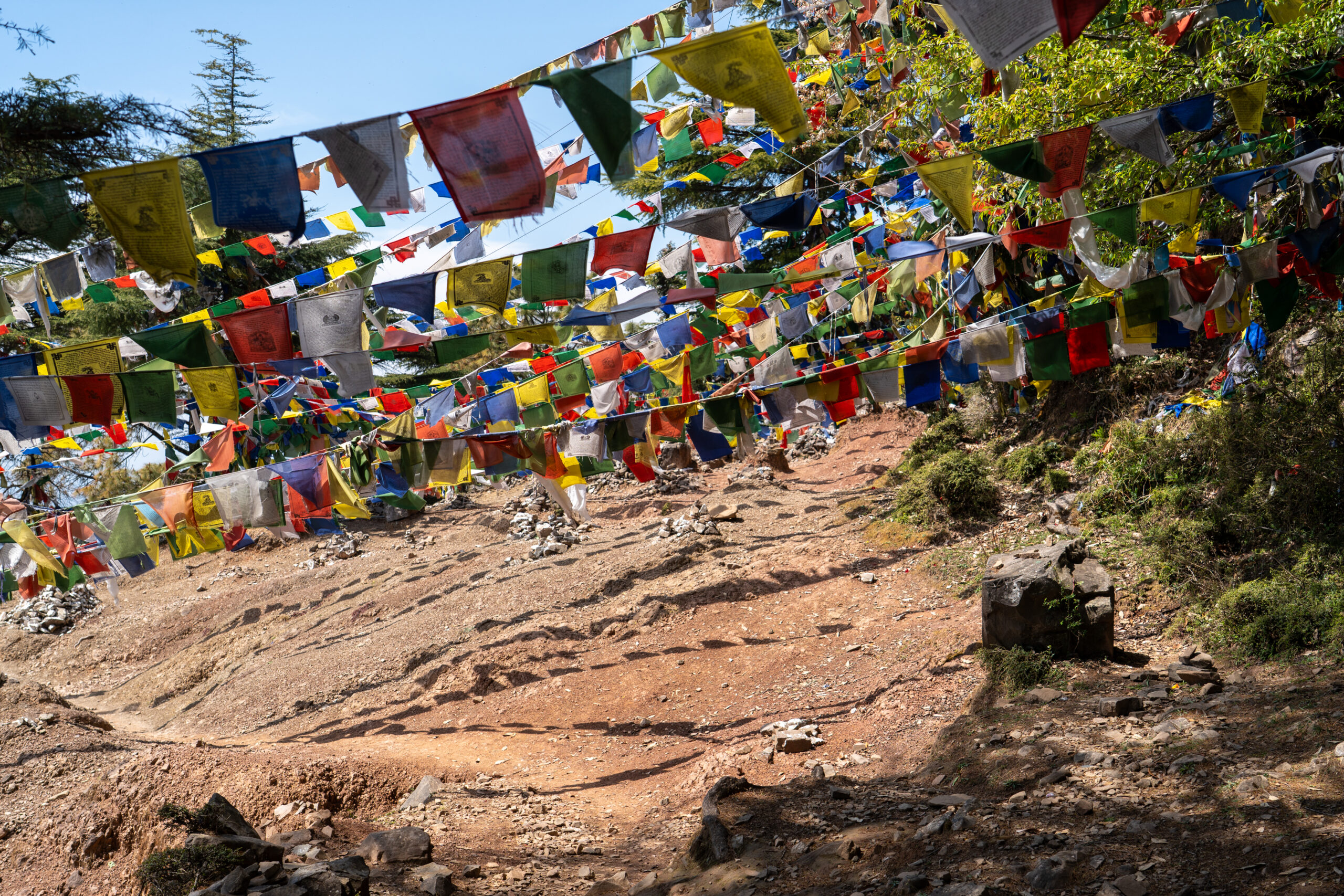 As it was still quiet, I decided to walk the Kora circuit around the temple, a peaceful walking path used for circumambulation, a sacred Buddhist practice. Lined with prayer wheels, fluttering flags, and small shrines, the trail winded through quiet forested areas and offered beautiful views of the mountains. According tradition I walked the circuit clockwise, spinned some wheels and chanted “Om Padme Hum”, which created a calm, almost meditative atmosphere that reflected Tibetan spiritual traditions.