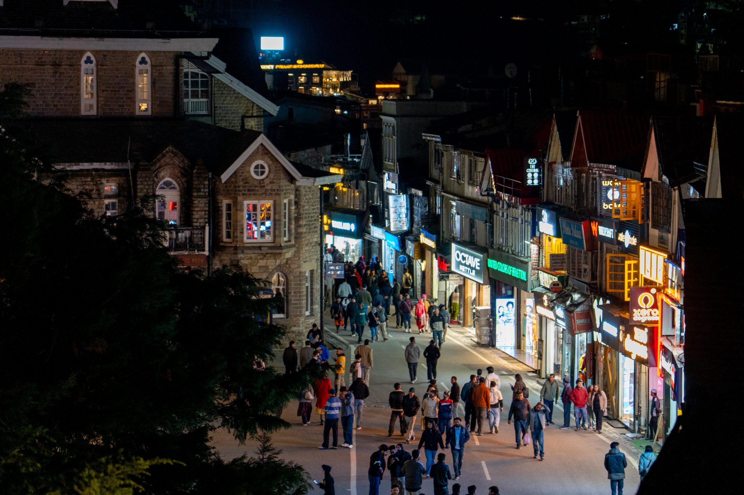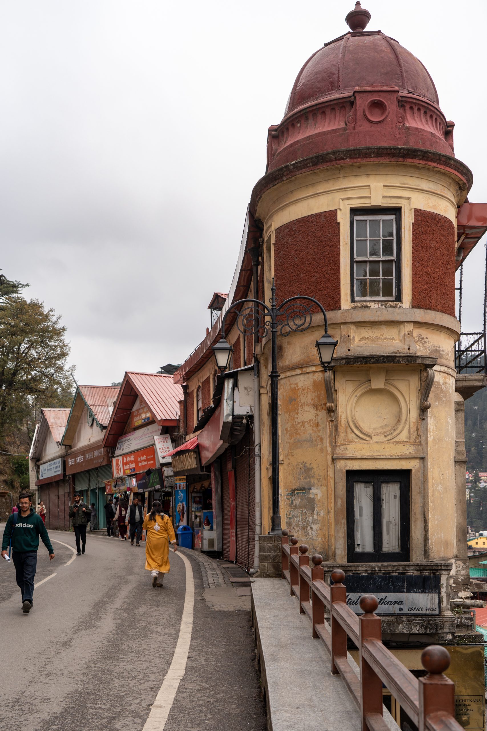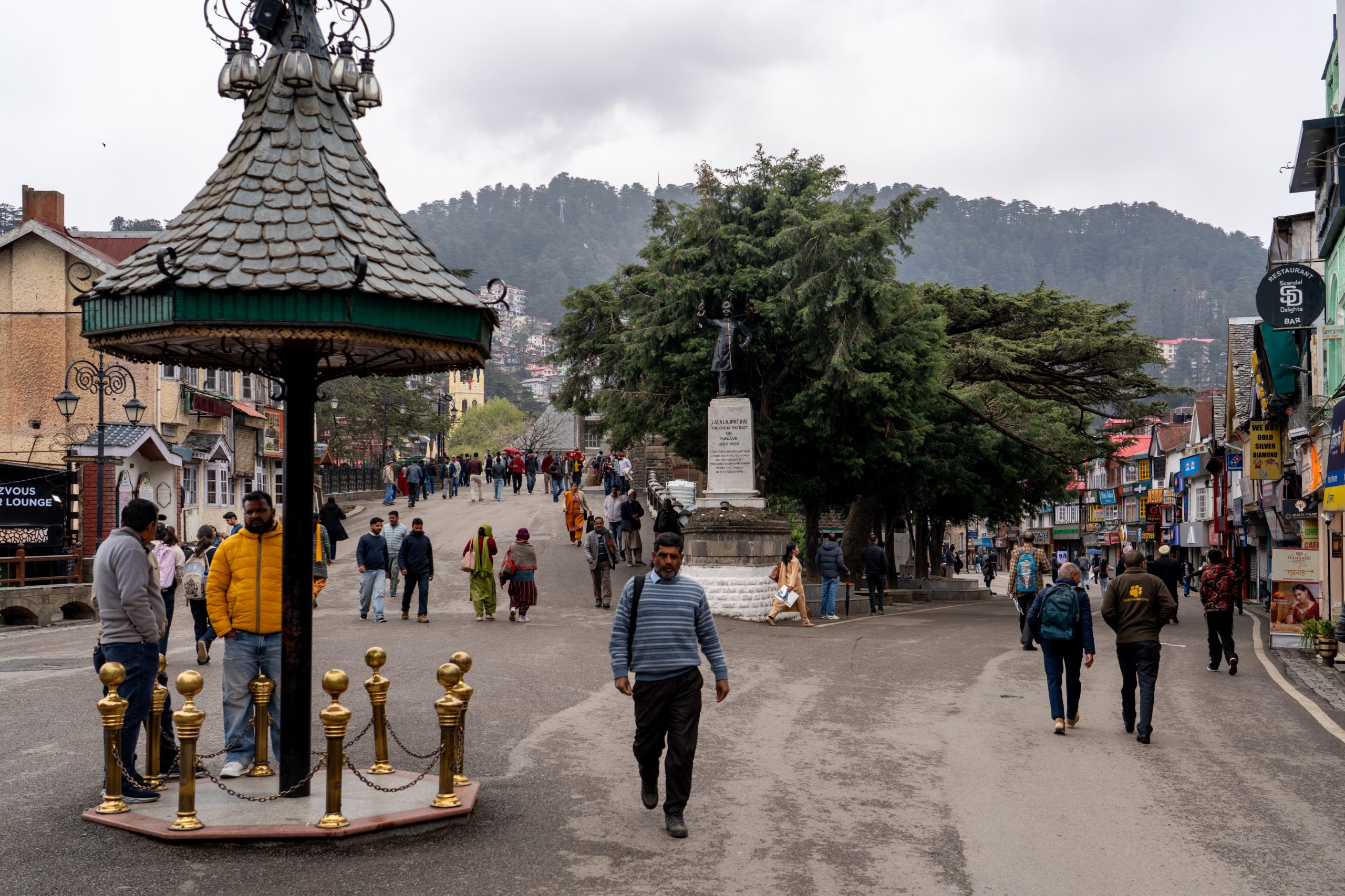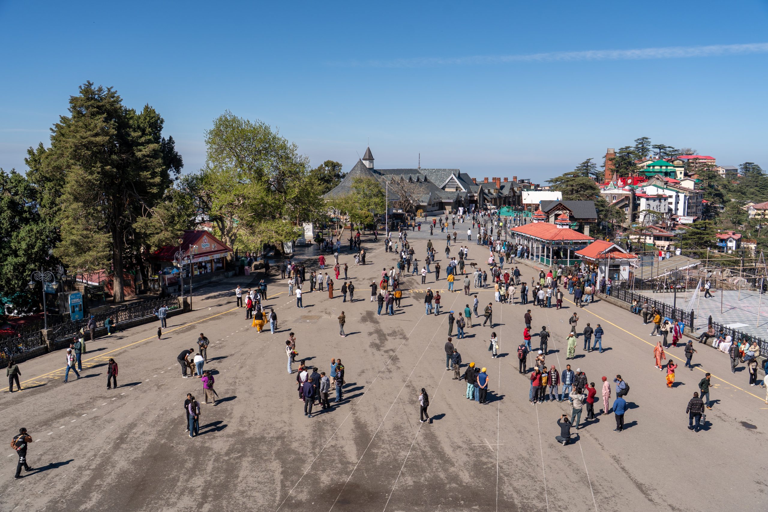 Mall Road is a long, gently curving promenade that feels like the spine of the hill station. Vehicles are completely absent, so it belongs entirely to pedestrians. On one side, rows of colonial-era buildings rise in layers—wooden façades, sloping roofs, and balconies that hint at British-era charm. On the other side, the land falls away into deep valleys.