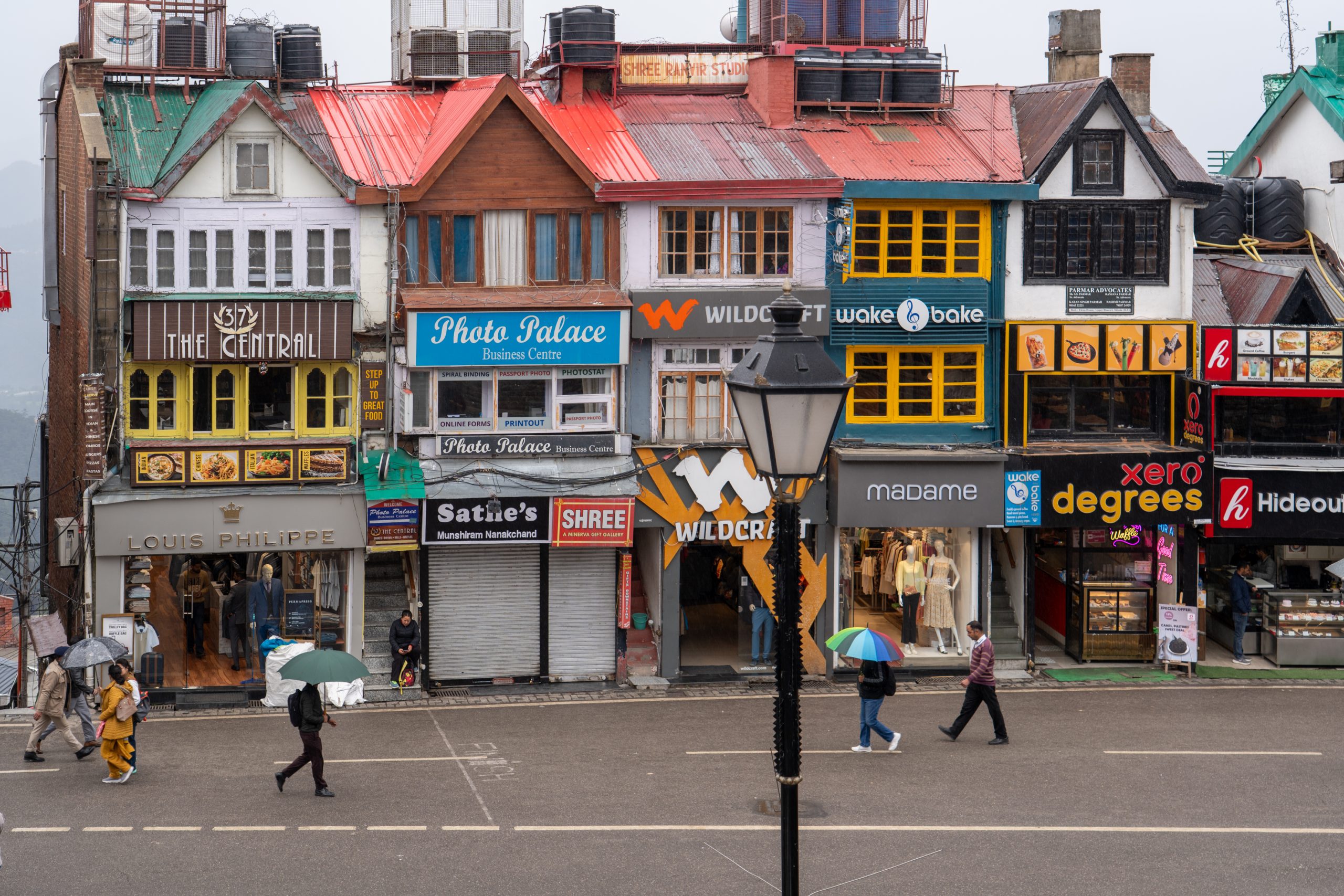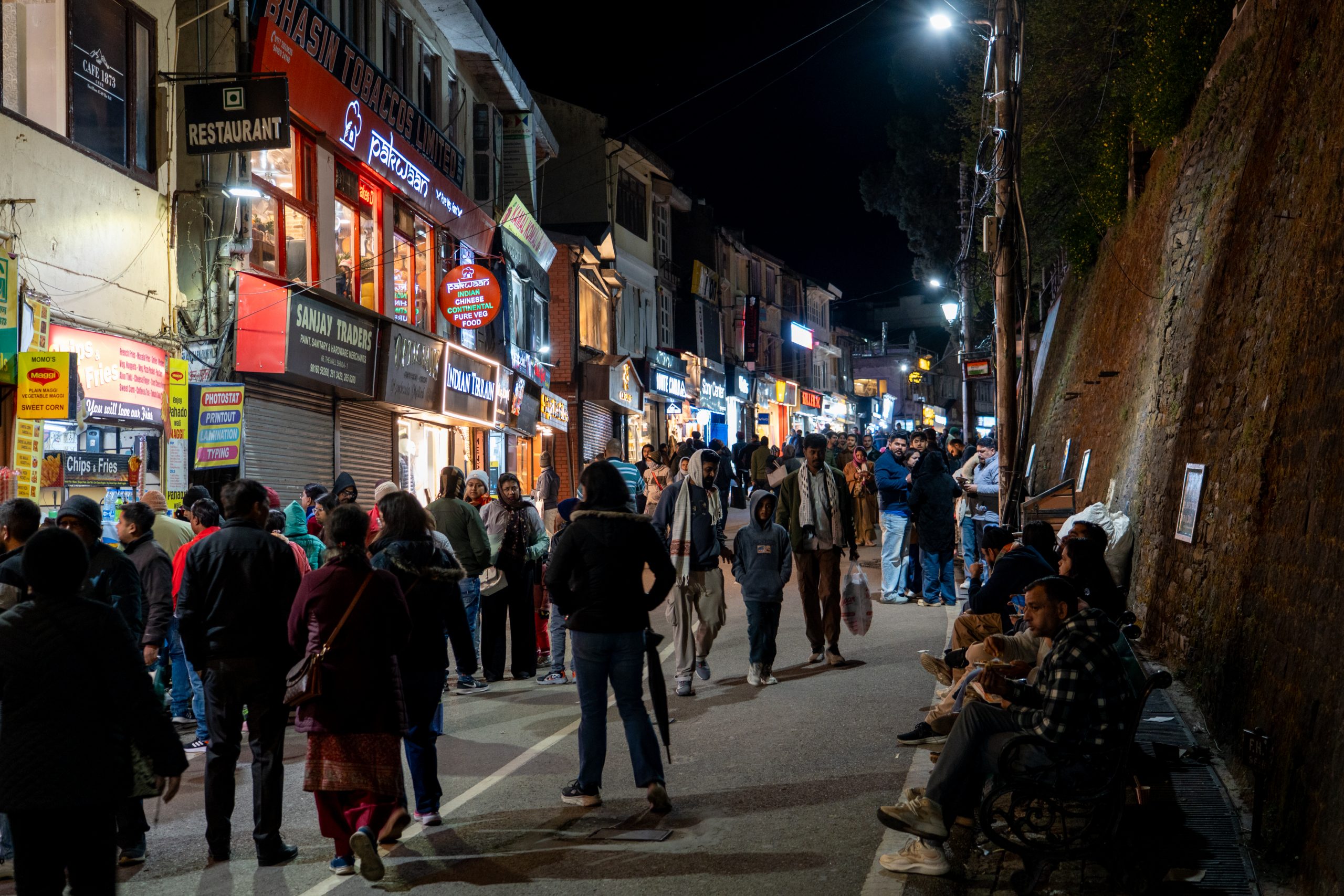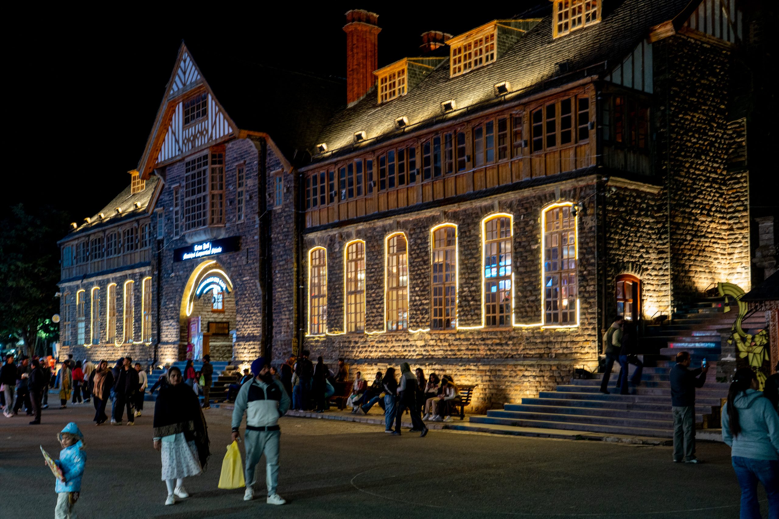 Mall Road is a long, gently curving promenade that feels like the spine of the hill station. Vehicles are completely absent, so it belongs entirely to pedestrians. On one side, rows of colonial-era buildings rise in layers—wooden façades, sloping roofs, and balconies that hint at British-era charm. On the other side, the land falls away into deep valleys.