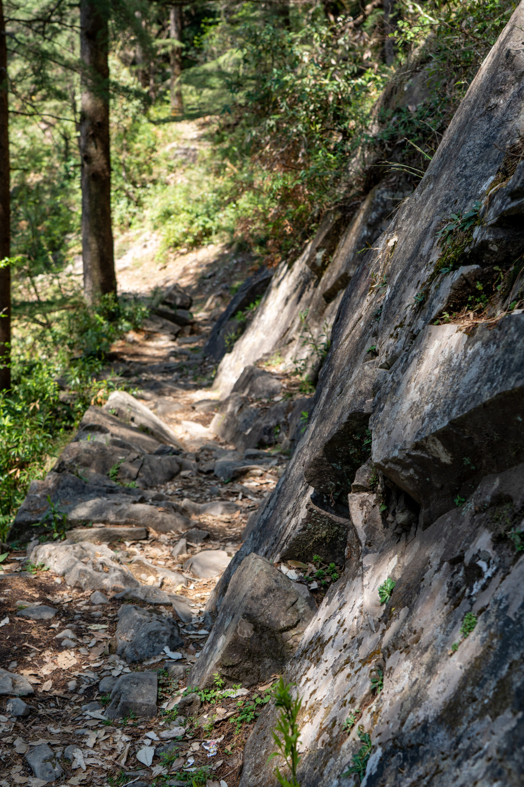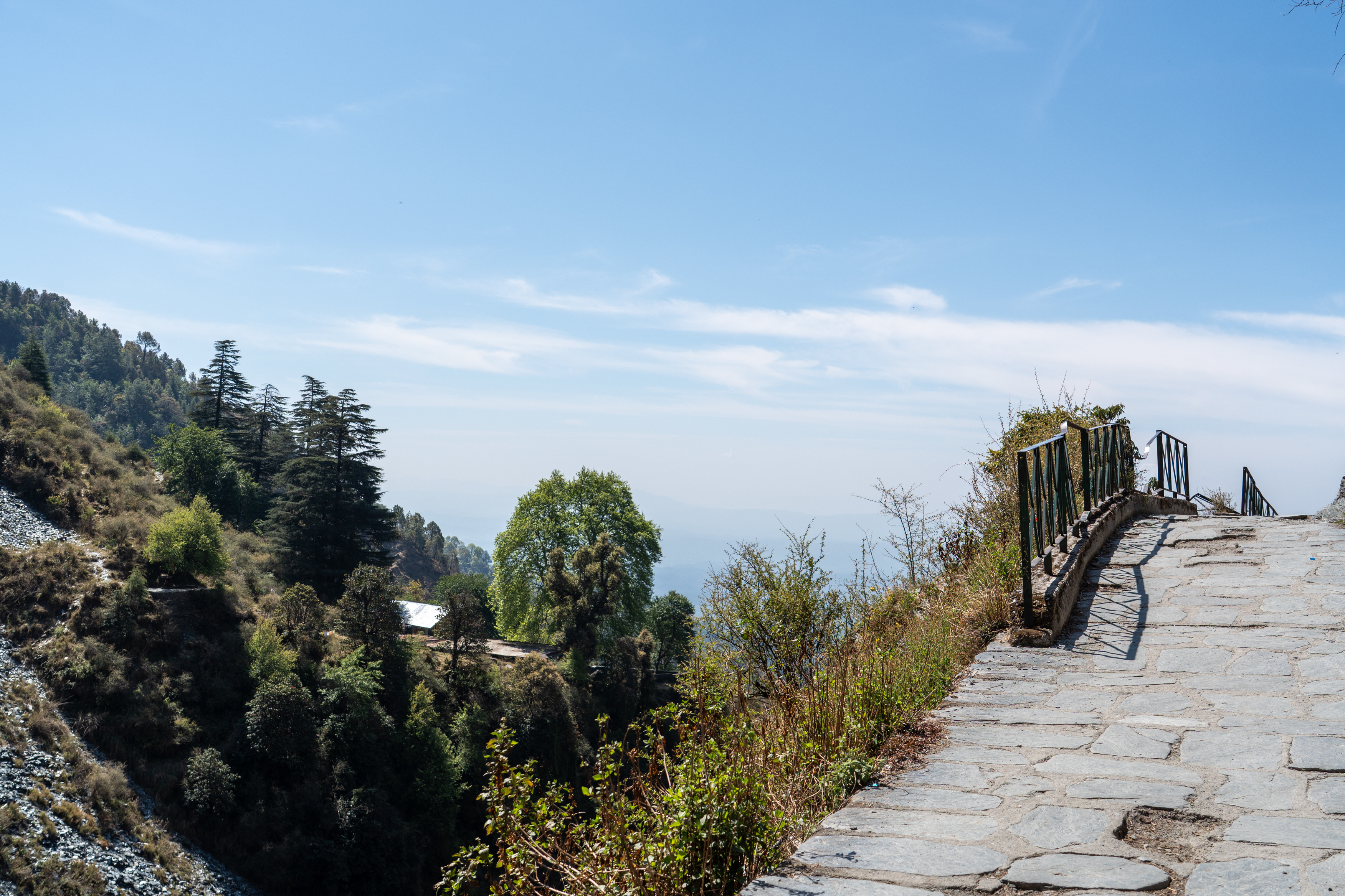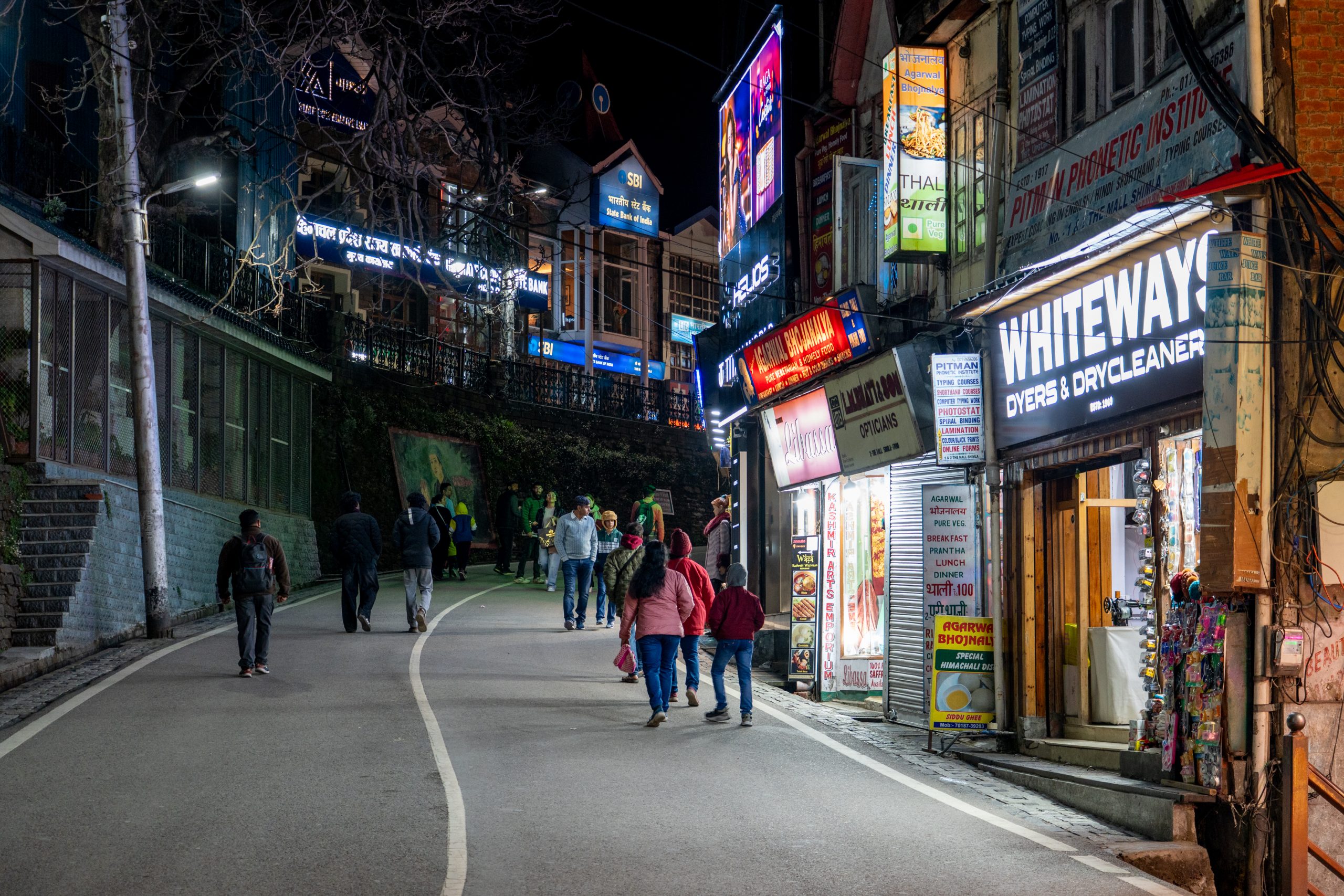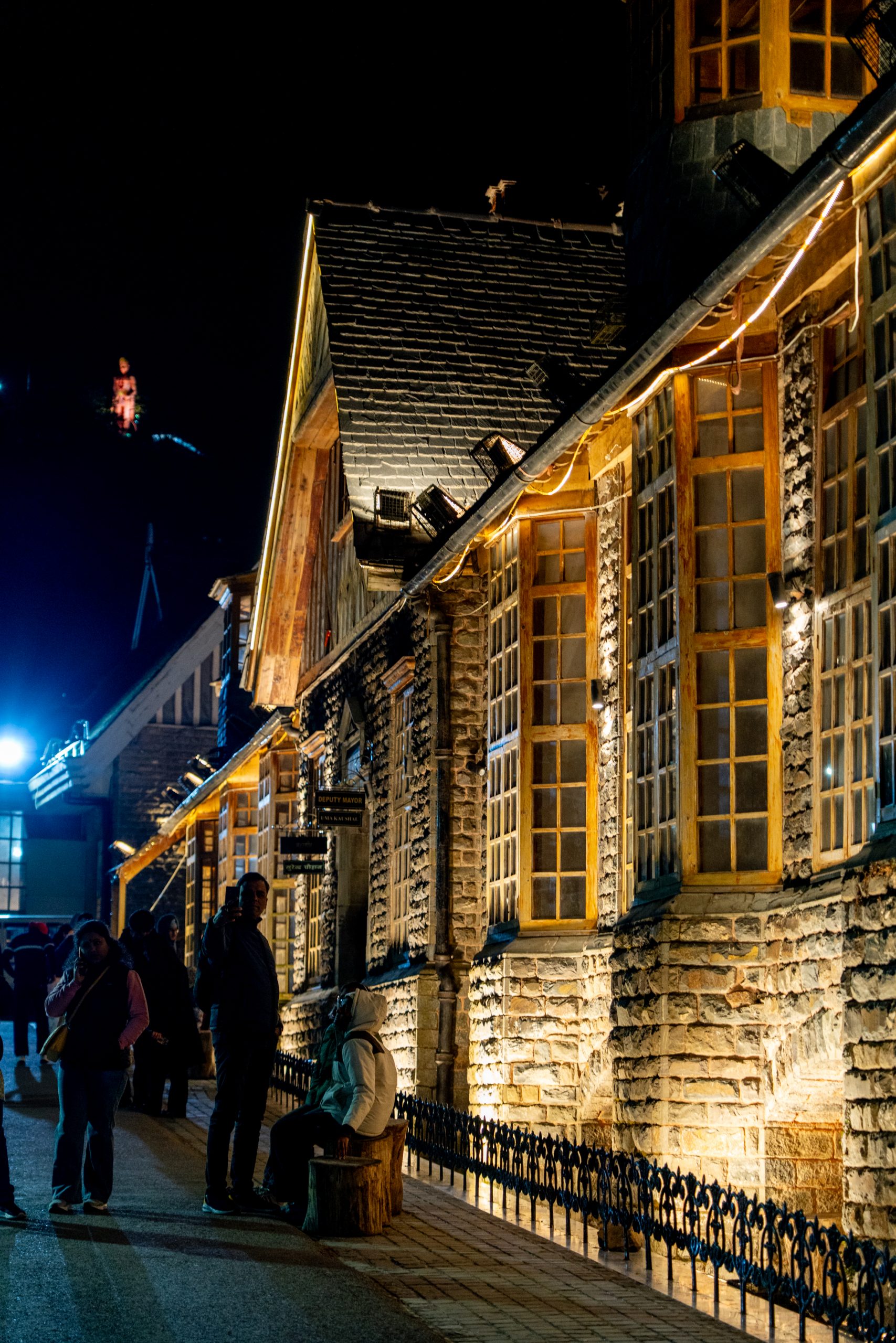 Mall Road is a long, gently curving promenade that feels like the spine of the hill station. Vehicles are completely absent, so it belongs entirely to pedestrians. On one side, rows of colonial-era buildings rise in layers—wooden façades, sloping roofs, and balconies that hint at British-era charm. On the other side, the land falls away into deep valleys.