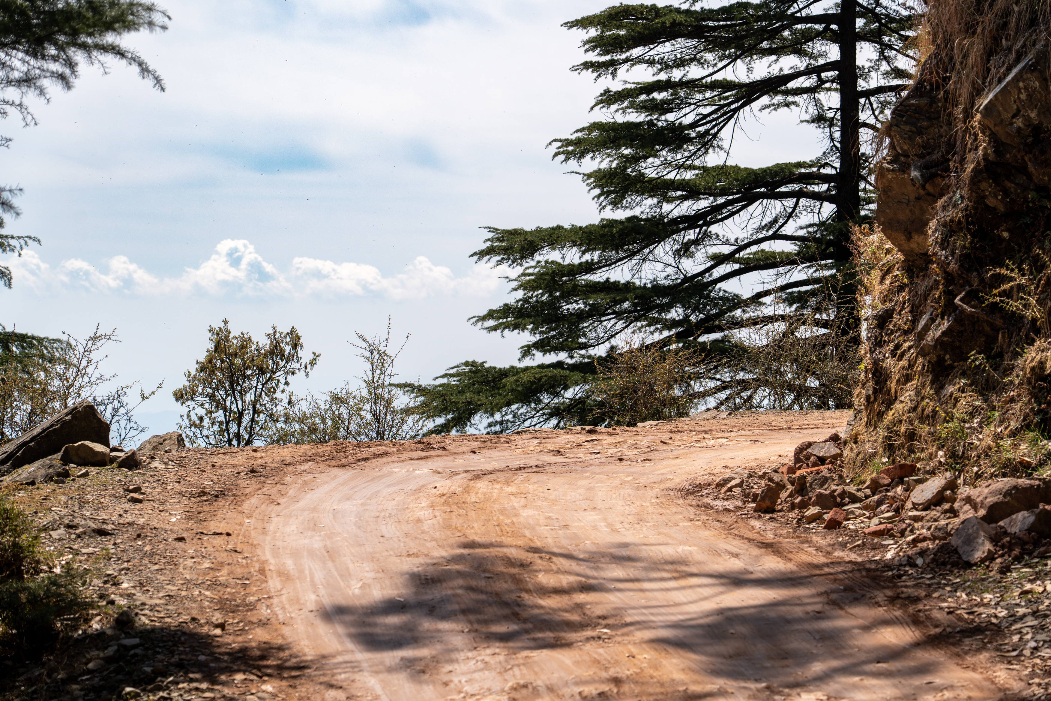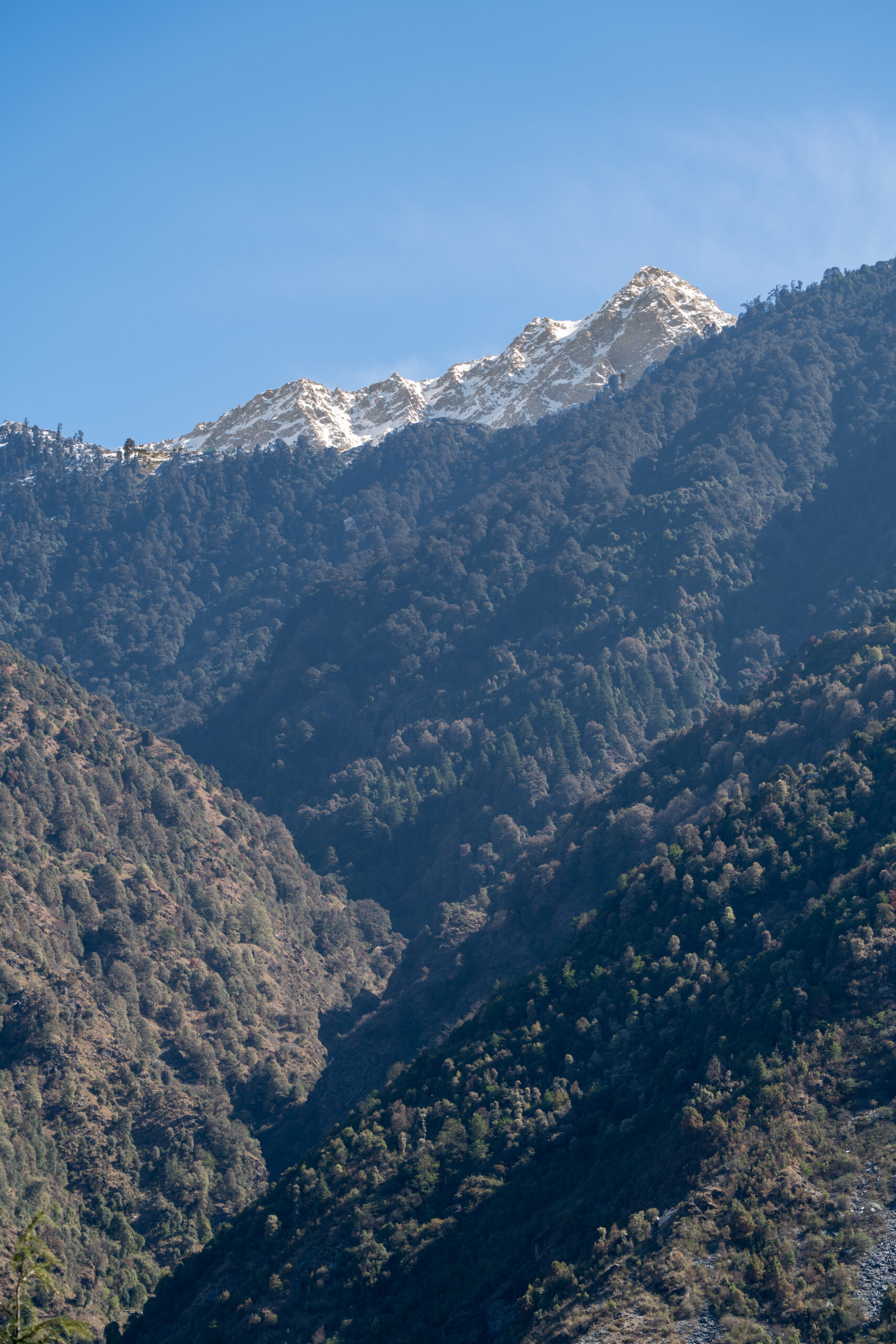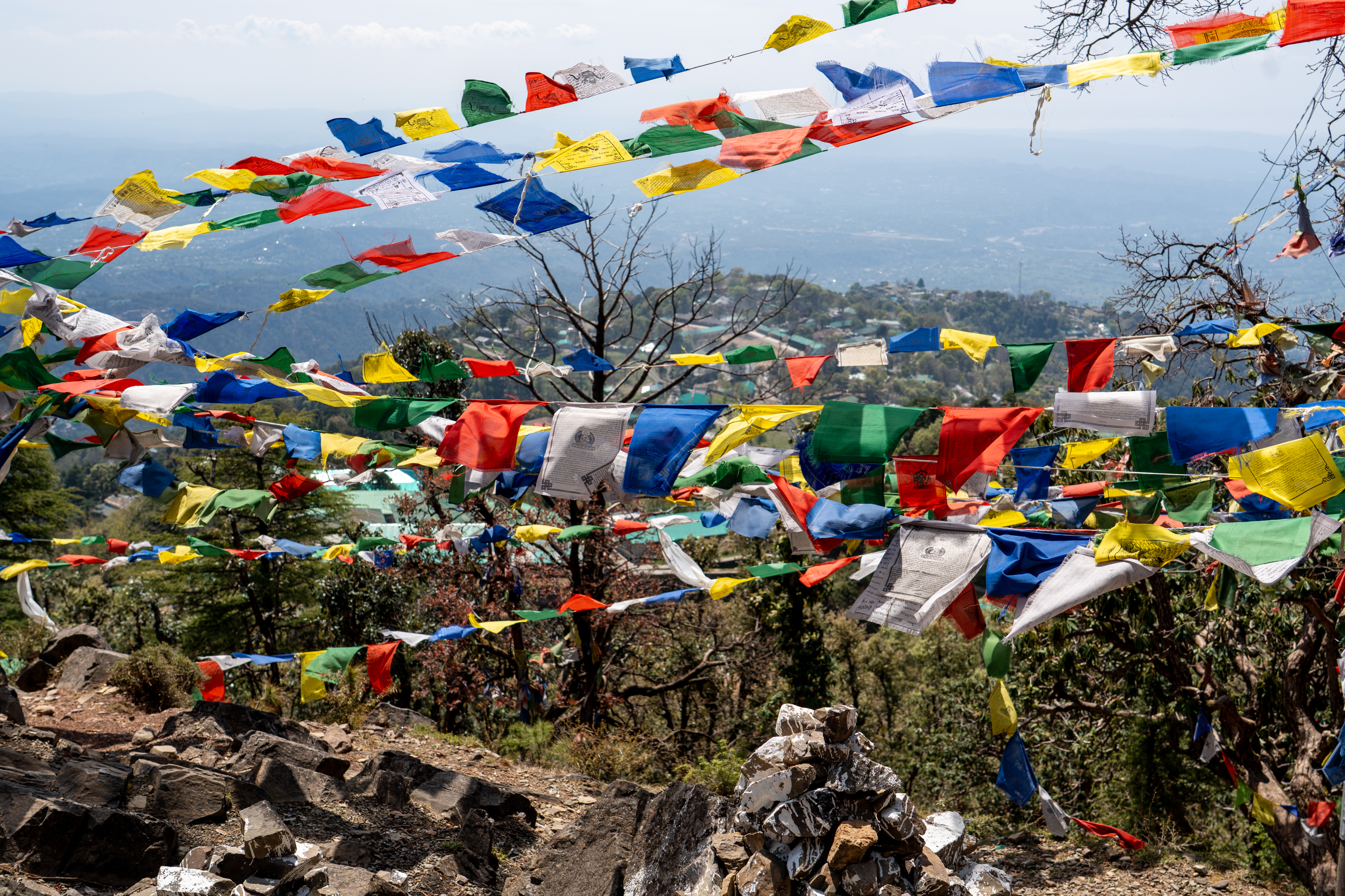 The next part to Naddi via the forest trails was without doubt the most spectacular part of the hike, winding through dense pine and deodar woods away from the main road. It started from Dharamkot, where I followed narrow dirt paths that gently climbed and curved through the forest, with birdsong, filtered sunlight, and occasional clearings revealing views of the Kangra Valley. Midway, a definite and unexpected highlight was an area filled with Buddhist prayer flags, a quiet spiritual spot surrounded by trees where I paused a while to rest and reflect. After this, the trail continued gradually upward, eventually opening out as I came closer to Naddi, where wider views of the Dhauladhar range and a calm village atmosphere provided a serene and rewarding end to this part of the hike.